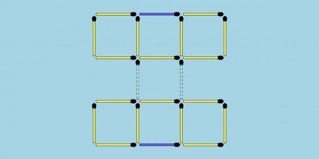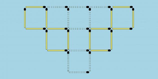 6 jumboqning javobi. Eng past kvadrat va yuqori qatorning o’rtasidagi kvadratni butunlay olib tashlang. Shuningdek, ikkita gugurtni maydonlardan olib tashlang.