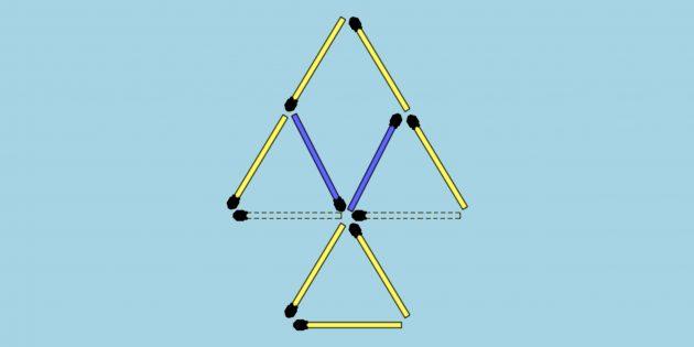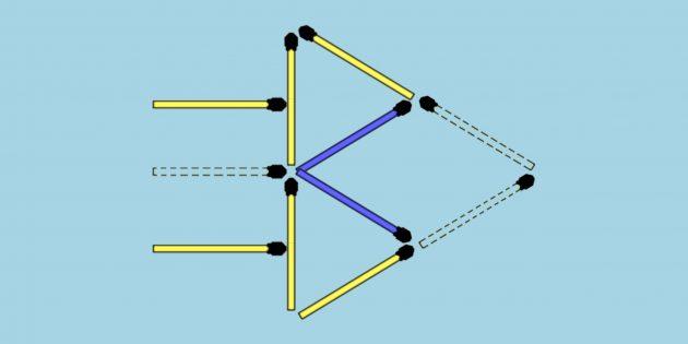 3 jumboqning javobi. Bitta gugurtni yon tomonga siljitib, uzun mildan ikkita qisqa o’qni yasang. Ikki uchburchakni olish uchun o’q uchini shunday harakatlantiring.